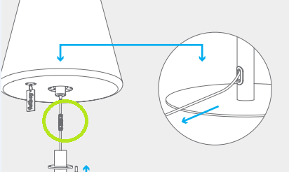 - Check to make sure that the lampshade is properly connected to the power cord. To do this, lift the lampshade and connect the cord to the one that passes through the pole to the base, as shown in the illustration. Don’t open the lampshade!