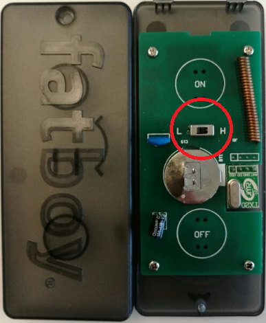 Open the remote control and set the switch to H. The picture below shows you how to do this. Use the wall switch to turn the lamp on and off and use the remote control to adjust the brightness by pressing + or –.
